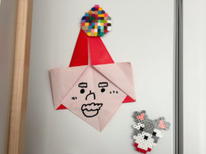 「季節のおりがみ作って〜」とお願いすると、面倒臭そうに2分でサンタを作ってくれた。やっつけだけど、いい顔。